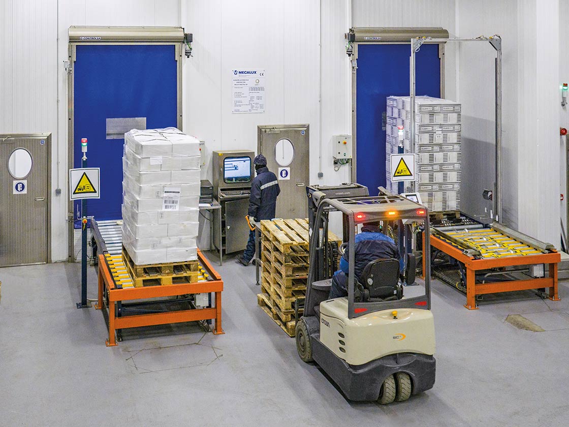 Il Pallet Shuttle automatico 3D può ospitare 5.827 pallet di materie prime e prodotti finiti a -24 °C. All'interno del magazzino, dieci shuttle autonomi circolano lungo i corridoi in diverse direzioni e cambiano livello in modo coordinato per movimentare ogni pallet quando l'operazione lo richiede. Un software di gestione delle flotte sviluppato da Mecalux controlla il traffico delle navette, attraverso la rete di scaffalature e questo assicura una circolazione continua e fluida, previene gli intoppi ed evita le collisioni tra gli shuttle.