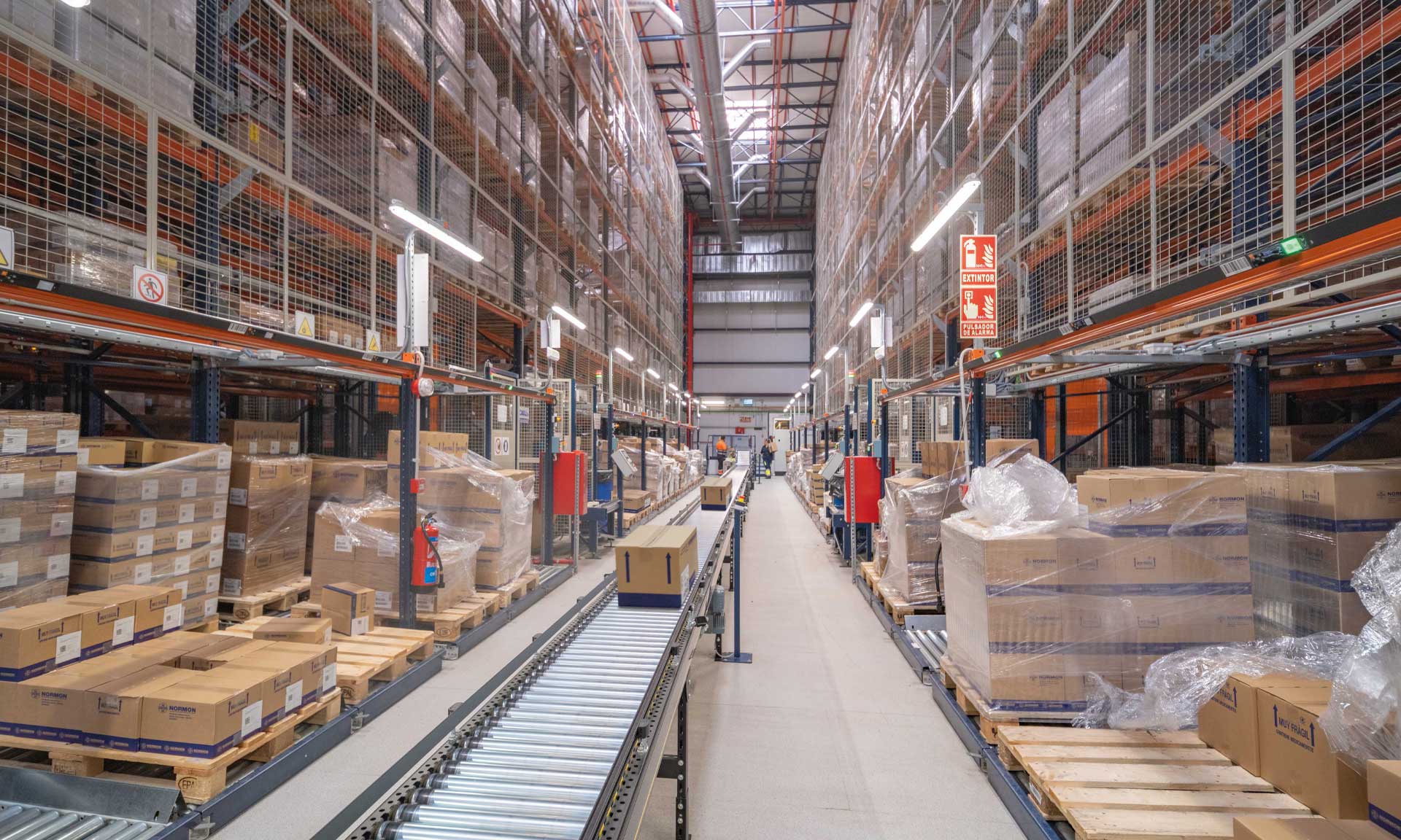 Successivamente, i contenitori vengono smistati su un circuito di trasportatori suddiviso in tre diramazioni (smistatore di tipo sorter) e scendono fino alla zona spedizioni al piano inferiore. Qui, con l'aiuto di terminali a radiofrequenza, gli operatori raccolgono i contenitori mentre scorrono lungo i 140 scaffali per il picking dinamico e li posizionano sui pallet che saranno spediti ai clienti.