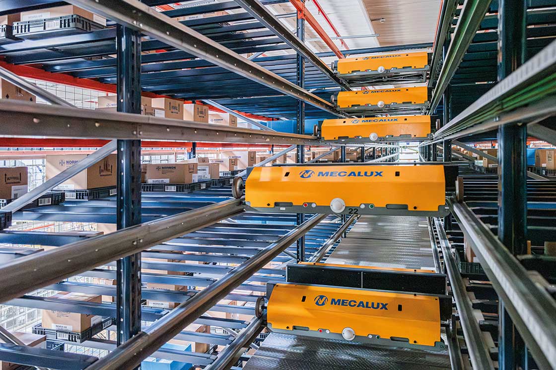 Il sistema a navetta per contenitori di Normon è una soluzione di stoccaggio progettata per il picking di massa: comprende 46 navette che movimentano contenitori su scaffali a tripla profondità con una capacità di 22.000 unità. I contenitori, stoccati su vassoi da 400 x 400 mm, sono gestiti in modo completamente automatizzato. Questa tecnologia consente agli operatori di concentrarsi sulla preparazione degli ordini mentre il sistema esegue i rifornimenti.
