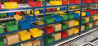 - Stazioni di picking tradizionali. Questa soluzione, idonea per una preparazione sporadica degli ordini, si basa su un circuito di trasportatori a forma di U situato nella parte frontale del magazzino (con trasportatori a rulli) o nella parte laterale (con trasportatori a cinghie). Gli operatori estraggono gli articoli dai contenitori ricevuti dal magazzino e li posizionano nelle ubicazioni alle loro spalle. In questo modo, si possono processare dalle 60 alle 120 linee/ora (in funzione delle dimensioni dei contenitori) per preparare gli ordini di una stessa referenza.