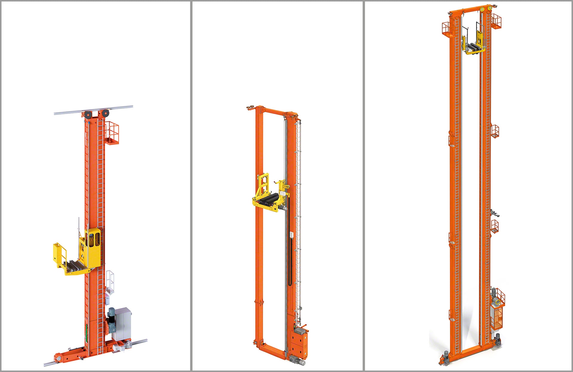 Il trasloelevatore è un’attrezzatura completamente automatica ad alto rendimento composta da differenti elementi, tra i quali spiccano le colonne, le testate inferiore e superiori, la culla di elevazione, il sistema di estrazione e l’azionamento dell’elevazione.