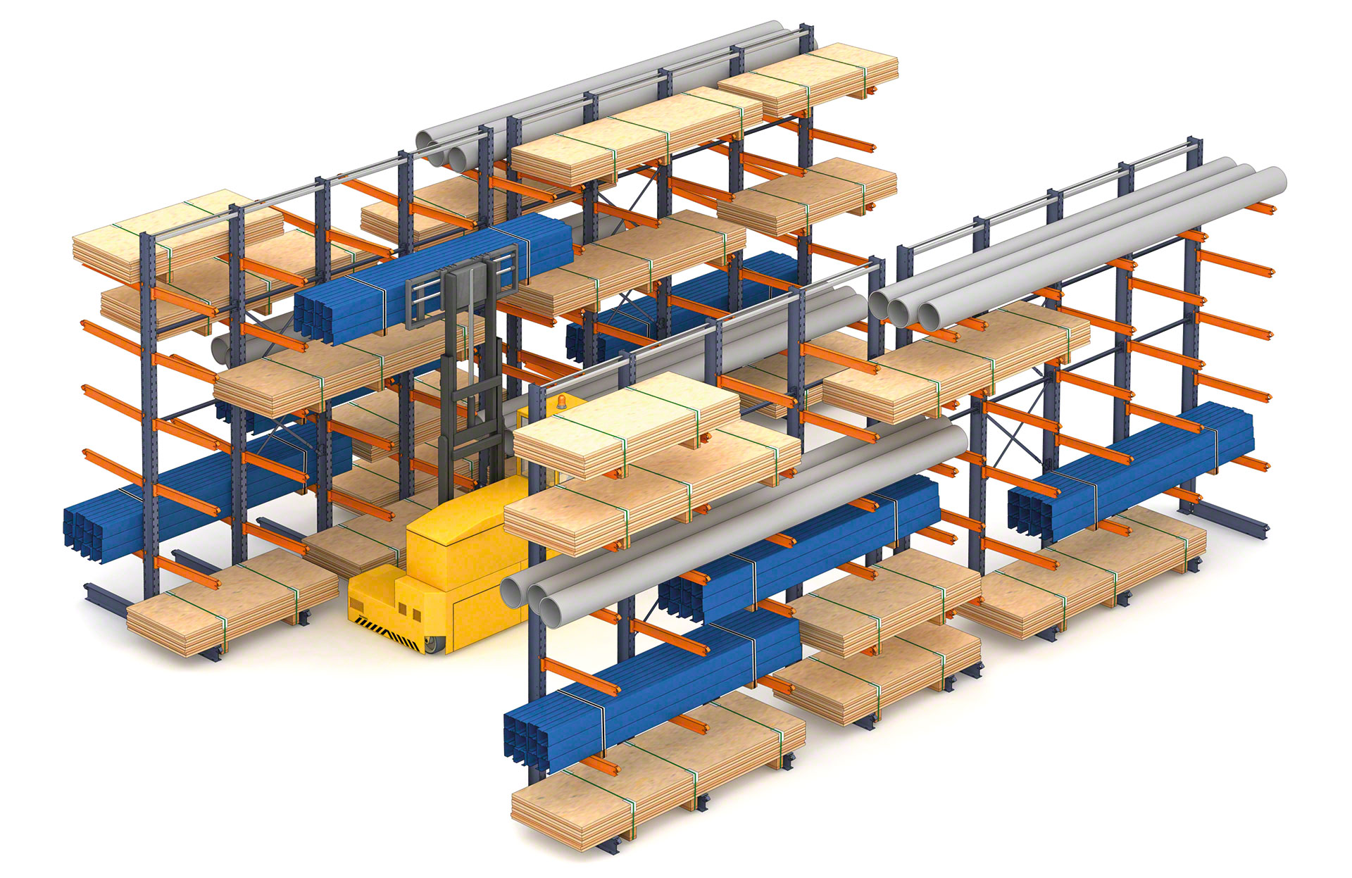 La scaffalature tipo cantilever è progettata per stoccare carichi lunghi e voluminosi, come profili metallici, tubi in plastica o tavole in legno. Il sistema offre accesso diretto alla merce stoccata, il che facilita la movimentazione manuale (se si tratta di carichi leggeri) o tramite mezzi di movimentazione (per carichi pesanti).