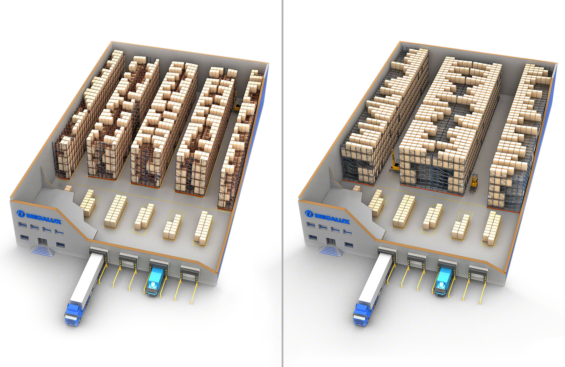 - Risparmio di spazio: l’eliminazione dei corridoi intermedi favorisce un maggior sfruttamento della superficie disponibile e aumenta la capacità di stoccaggio.